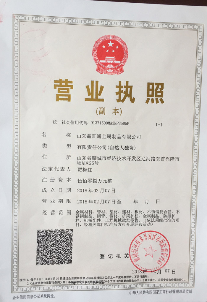 山東鑫旺通金屬制品有限公司座落在管材的生產(chǎn)基地--聊城市。 我公司引進(jìn)國(guó)外新技術(shù),專(zhuān)門(mén)生產(chǎn)不銹鋼復(fù)合管、不銹鋼復(fù)合管欄桿、不銹鋼/碳素鋼復(fù)合圓管、方管、橢圓管、橋梁護(hù)欄、景觀(guān)護(hù)欄等系列新型材料的企業(yè)。公司外復(fù)不銹鋼復(fù)合管車(chē)間擁有八條自主知識(shí)產(chǎn)權(quán)生產(chǎn)線(xiàn),專(zhuān)業(yè)從事外復(fù)不銹鋼/碳素鋼復(fù)合管生產(chǎn)及工程設(shè)計(jì)、制作、安裝、施工。先進(jìn)的生產(chǎn)工藝和嚴(yán)格的檢測(cè)手段,使企業(yè)產(chǎn)品全部通過(guò)不銹鋼復(fù)合管?chē)?guó)家標(biāo)準(zhǔn)(GB/T18704-2008)。